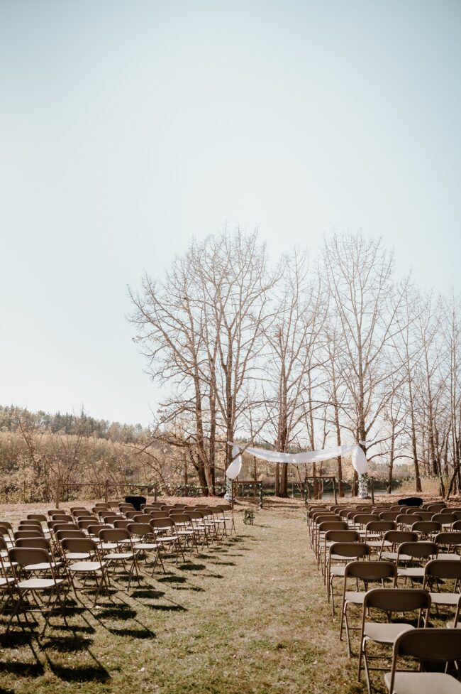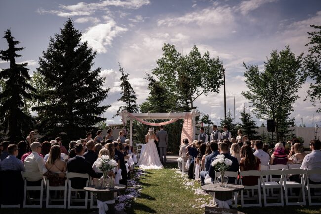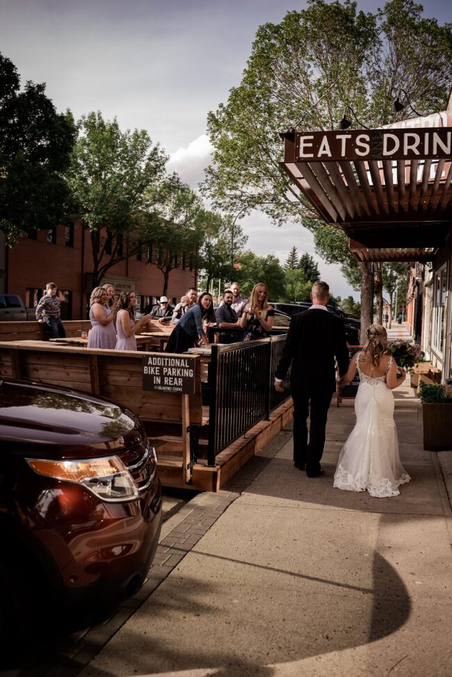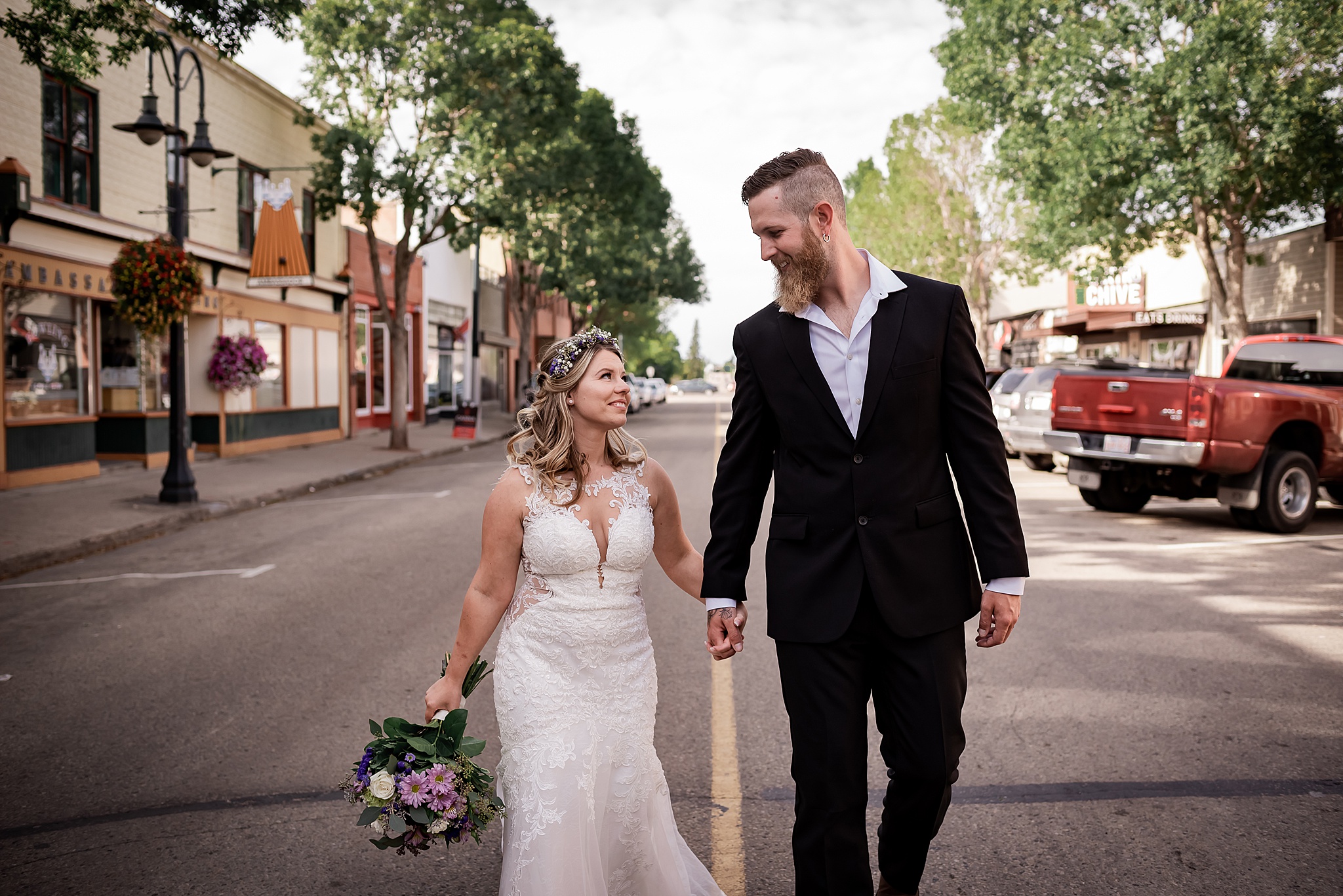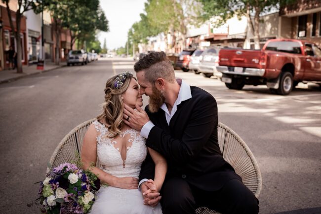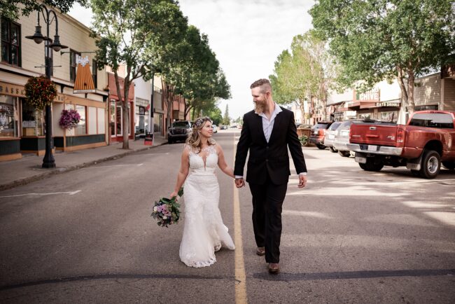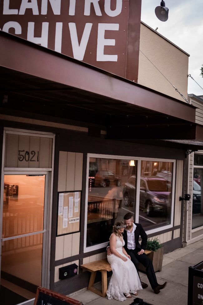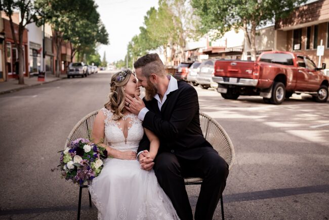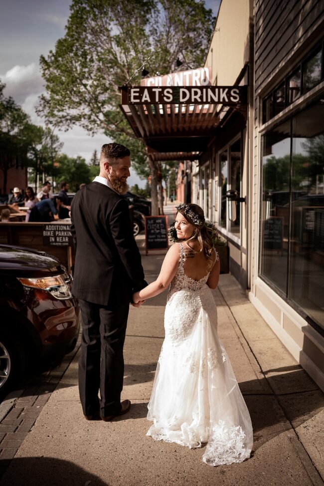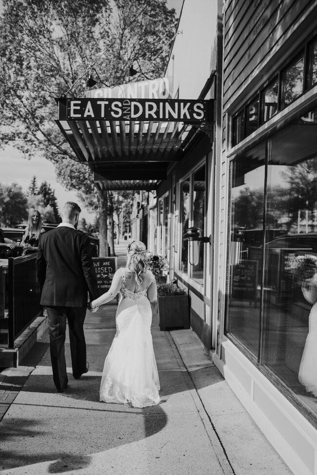 Getting married on your own property is so special, sharing your love with your friends and family in your stunning backyard is the perfect location for a wedding. The amazing arch and wooden benches made it such a beautiful setting to say I do! Heading downtown Lacombe for Portraits and a intimate Dinner celebration at Cilantro & Chive.